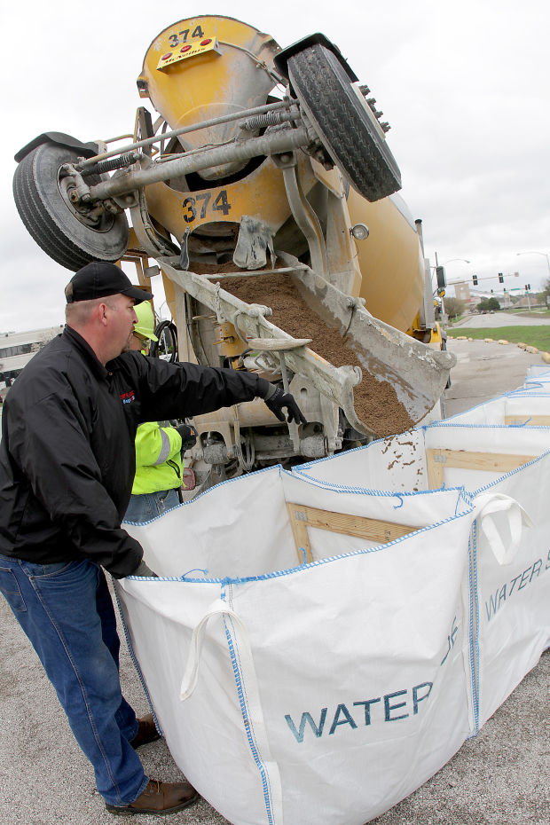 | Tom Spalj, owner of DRIPS LLC, demonstrates a new flood protection system called Big Bags USA on Thursday in downtown Davenport. Photo by Larry Fisher, QUAD-CITY Times